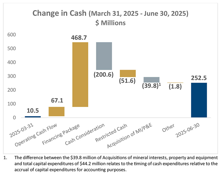 - Cash at June 30, 2025 totaled $252.5 million reflecting approximately $475.0 million of gross proceeds ($468.7 million of net proceeds after share issue costs) from a financing package (the "Financing Package") arranged in conjunction with the Porcupine Acquisition, as well as $67.1 million of net cash from operating activities generated during Q2 2025, partially offset by $200.6 million of cash consideration paid for the Porcupine Operations at closing, the $44.2 million of capital expenditures during Q2 2025, as well as the impact of $51.6 million of restricted cash related to letters of credit and cash collateral for government required financial assurances in relation to closure plans involving the Porcupine assets.