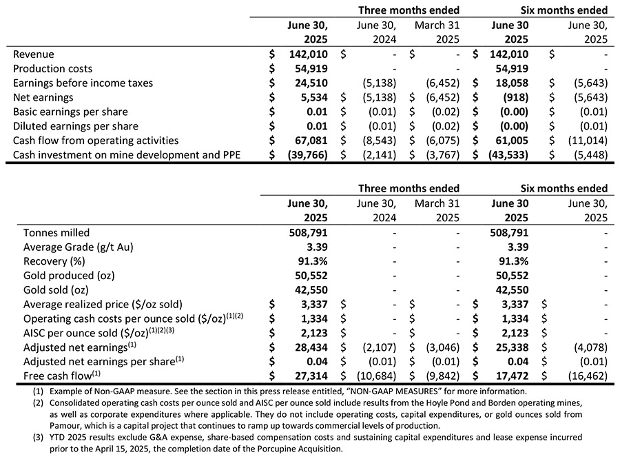 - Solid operating performance in initial quarter of production at Porcupine (April 16, 2025, to June 30, 2025):