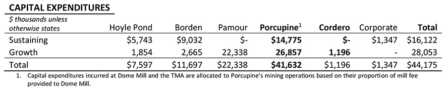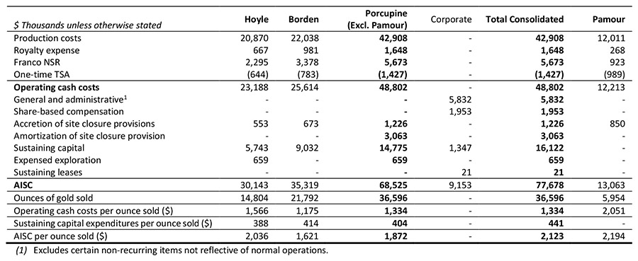 - Operating cash costs and AISC include results from the Hoyle Pond and Borden operating mines, as well as corporate expenditures where applicable. They do not include operating costs, capital expenditures, or gold ounces sold from Pamour, which is a capital project that continues to ramp up towards commercial levels of production.