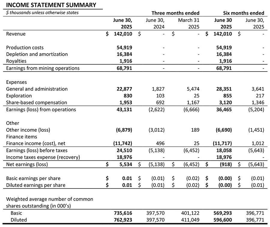 - Net earnings totaled $5.5 million ($0.01 per basic share) versus a loss of $5.1 million ($0.01 per basic share) in Q2 2024 and net loss of $6.5 million ($0.02 per basic share) in Q1 2025.