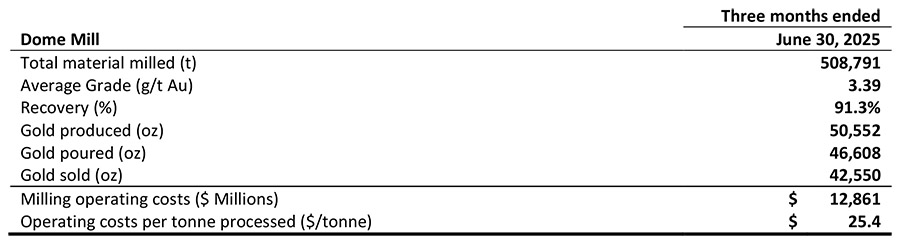 For the period April 16, 2025, to June 30, 2025, a total of 508,791 tonnes were processed at Dome Mill at an average grade of 3.39 g/t, with recovery rates averaging 91.3%. A total of 50,552 ounces of gold were produced over this period, with total gold poured of 46,608 ounces. Availability rates at the Dome Mill during Q2 2025 were impacted by a two-week maintenance shutdown, previously scheduled by the prior owner, for the purpose of replacing equipment in the thickening tank. The Company used the occasion of the shutdown to advance multiple other projects, primarily in the crushing, grinding and carbon handling circuits. Based on operating days during Q2 2025, mill throughput averaged approximately 8,500 tonnes per day. Mill operating costs during Q2 2025 totaled $12.9 million for an average of $25.4 per tonne processed. These costs are allocated to the mine operations based on a proportion of total tonnes processed basis.