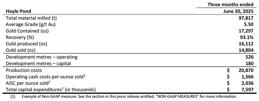 Gold production at Hoyle Pond from April 16, 2025, to June 30, 2025, totaled 16,112 ounces, which resulted from 97,817 tonnes being processed at an average grade of 5.50 g/t and average recoveries of 93.1%. Production during the quarter was primarily from the Lower S Zone on the 1965 and 1985 levels. A total of 45,160 tonnes were mined from April 16, 2025, to the end of Q2 2025, for an average mining rate of 594 tonnes per day. During Q2 2025, 52,657 tonnes of stockpiled material from Hoyle Pond were milled, which resulted in higher than planned tonnes milled for the quarter and a lower than expected average grade. The Company does not anticipate processing significant amounts of low-grade stockpiles from Hoyle Pond during the second half of 2025.