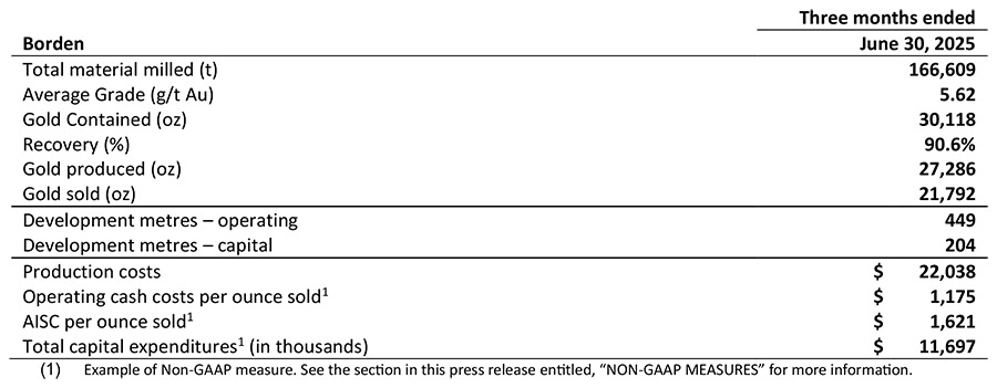 Gold production at Borden from April 16, 2025, to June 30, 2025, totaled 27,286 ounces, which resulted from 166,609 tonnes being processed at an average grade of 5.62 g/t and average recoveries of 90.6%. Production during Q2 2025 was mainly in the West and Central zones. A total of 123,743 tonnes of mineralization were mined from April 16, 2025, to the end of Q2 2025, for an average mining rate of 1,628 tonnes per day. Mining rates are expected to increase in the second half of 2025 as investments in new trucks and other equipment results in improved availability and utilization rates.