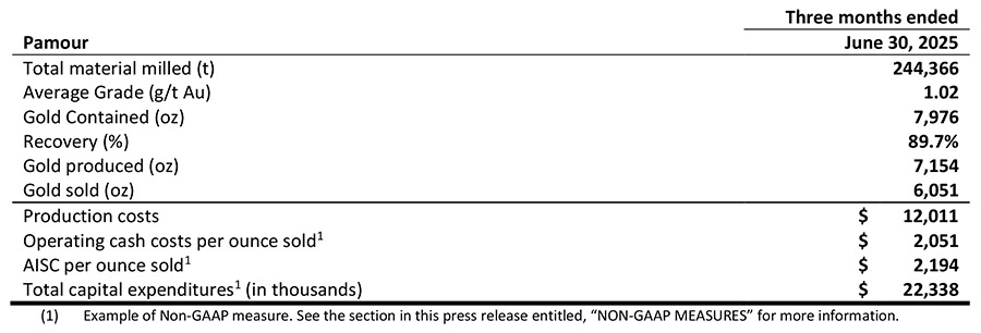 Production costs in Q2 2025 totaled $12.0 million. Operating cash costs1 averaged $2,051 per ounce sold, while AISC1 averaged $2,194 per ounce sold. All capital expenditures1 at Pamour in Q2 2025 were growth capital expenditures1 and related mainly to pre-stripping and allocated TMA capital expenditures.