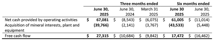 Free Cash Flow is a non-GAAP performance measure that is calculated as cash flows from operations net of cash flows invested in mineral property, plant, and equipment and exploration and evaluation assets. The Company believes that this measure is useful to the external users in assessing the Company's ability to generate cash flow after capital investments and build the cash resources of the Company.