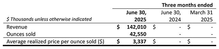 - Revenue in Q2 2025 totaled $142.0 million that resulted from gold sales of 42,550 ounces at an average realized gold price1 of $3,337 per ounce.