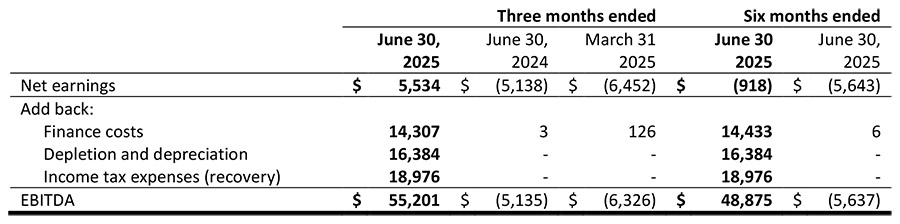 - EBITDA1,2 of $55.2 million compared to a loss before interest, taxes and depreciation and amortization of $5.1 million and $6.3 million in Q2 2024 and Q1 2025, respectively. The significant improvement in EBITDA performance resulted from revenue and earnings generated from gold sales following completion of the Porcupine Acquisition on April 15, 2025.