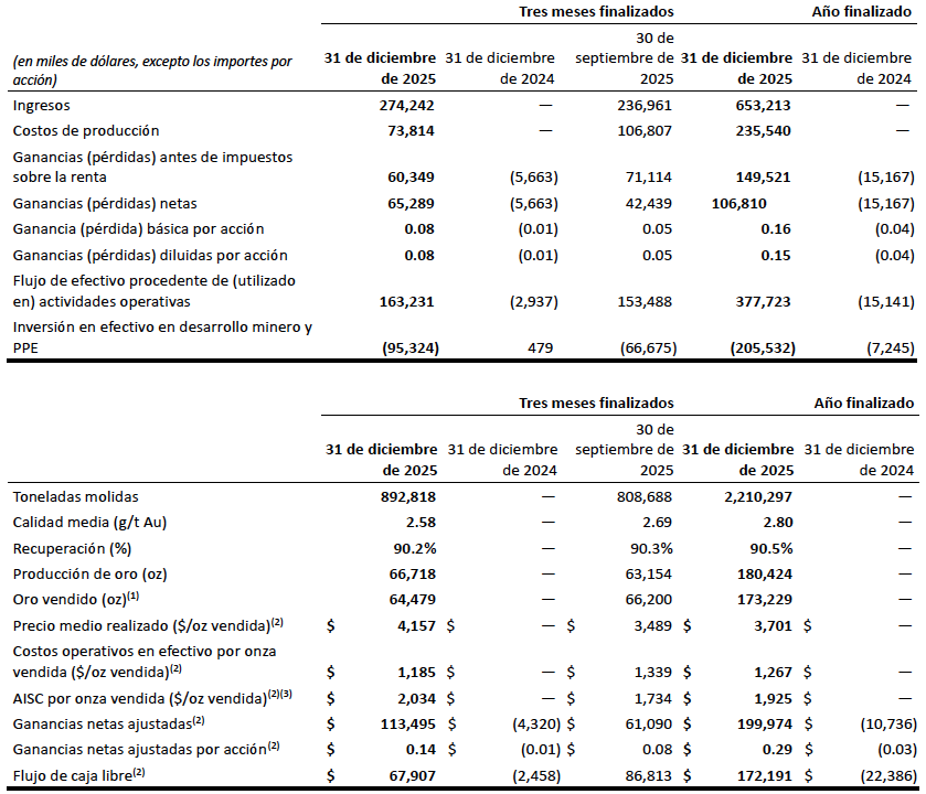 - La producción de oro entre el 16 de abril de 2025 y el 31 de diciembre de 2025 ascendió a 180 424 onzas, mientras que las ventas de oro ascendieron a 173 229 onzas. Los ingresos de 653.2 millones de dólares procedieron de las ventas de oro y de un precio medio realizado de 3,701 dólares por onza. Los costos de producción ascendieron a 238.5 millones de dólares. Los costos operativos en efectivo ascendieron a una media de 1,267 dólares por onza vendida, mientras que el AISC por onza vendida ascendió a una media de 1,925 dólares. La diferencia entre las onzas producidas y las onzas vendidas refleja en gran medida la entrega de onzas en especie relacionadas con el acuerdo de regalías con Franco-Nevada.