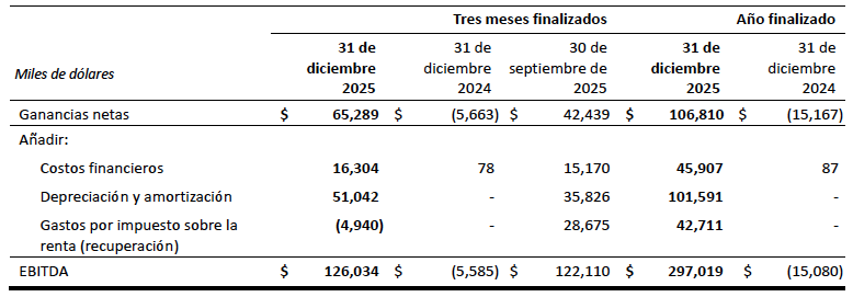 - Las ganancias netas ajustadas1 ascendieron a 113.5 millones de dólares, 0.14 dólares por acción básica, en comparación con la pérdida neta de 4.3 millones de dólares, o 0.01 dólares por acción básica, en el cuarto trimestre de 2024, y las ganancias netas ajustadas de 61.1 millones de dólares, o 0.08 dólares por acción básica, del trimestre anterior. Los ingresos netos ajustados del cuarto trimestre de 2025 difieren de los ingresos netos debido principalmente a la exclusión de los ingresos netos ajustados de un gasto único de 45,0 millones de dólares por la recuperación de minas en desuso, un gasto de 10.9 millones de dólares relacionado con las acciones emitidas para la Taykwa Tagamou Nation (“TTN”) (véase el comunicado de prensa de Discovery de fecha 21 de octubre de 2025 para obtener más información ), 4,0 millones de dólares en pérdidas por cambio de divisas, 3.0 millones de dólares relacionados con un acuerdo de servicios de transacción (“TSA”) con Newmont Corporation y 2.2 millones de dólares en ajustes de asignación del precio de compra.