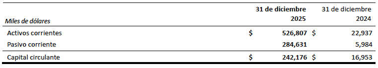- El capital circulante1 al 31 de diciembre de 2025 ascendió a 242.2 millones de dólares, frente a los 17.0 millones de dólares a 31 de diciembre de 2024 y los 224,2 millones de dólares a 30 de septiembre de 2025. El crecimiento del capital circulante en el cuarto trimestre de 2025 se debió al aumento del efectivo, compensado en parte por el aumento de los impuestos corrientes por pagar y el aumento de las cuentas por pagar y los pasivos acumulados en comparación con el 30 de septiembre de 2025. Los impuestos corrientes por pagar de la empresa a 31 de diciembre de 2025 ascendieron a 85.1 millones de dólares, que se pagarán en el primer trimestre de 2026.