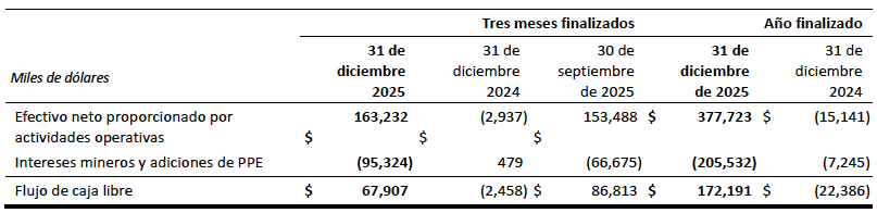 El flujo de caja libre es una medida de rendimiento no GAAP que se calcula como los flujos de caja de las operaciones netos de los flujos de caja invertidos en propiedades mineras, planta y equipo, y activos de exploración y evaluación. La Compañía cree que esta medida es útil para los usuarios externos a la hora de evaluar la capacidad de la Compañía para generar flujo de caja después de las inversiones de capital y construir los recursos de efectivo de la Compañía.