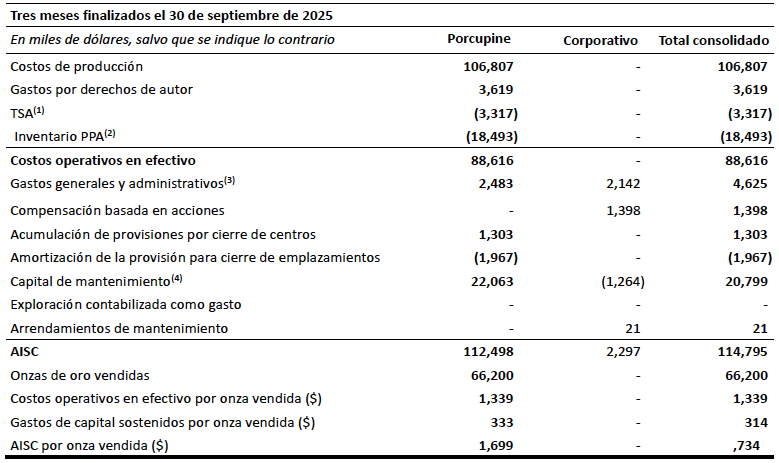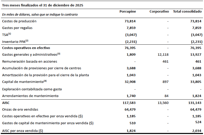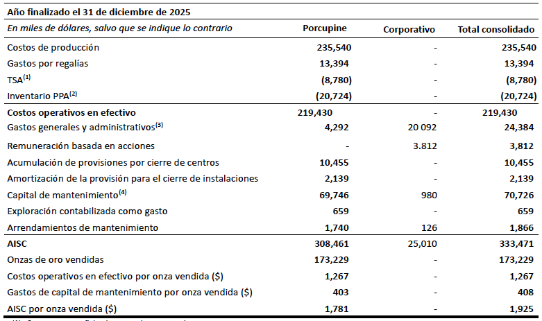 - Los resultados de 2025 excluyen los gastos generales y administrativos, los costos de compensación basados en acciones y los gastos de capital de mantenimiento y de arrendamiento incurridos antes del 15 de abril de 2025, fecha de finalización de la adquisición de Porcupine.